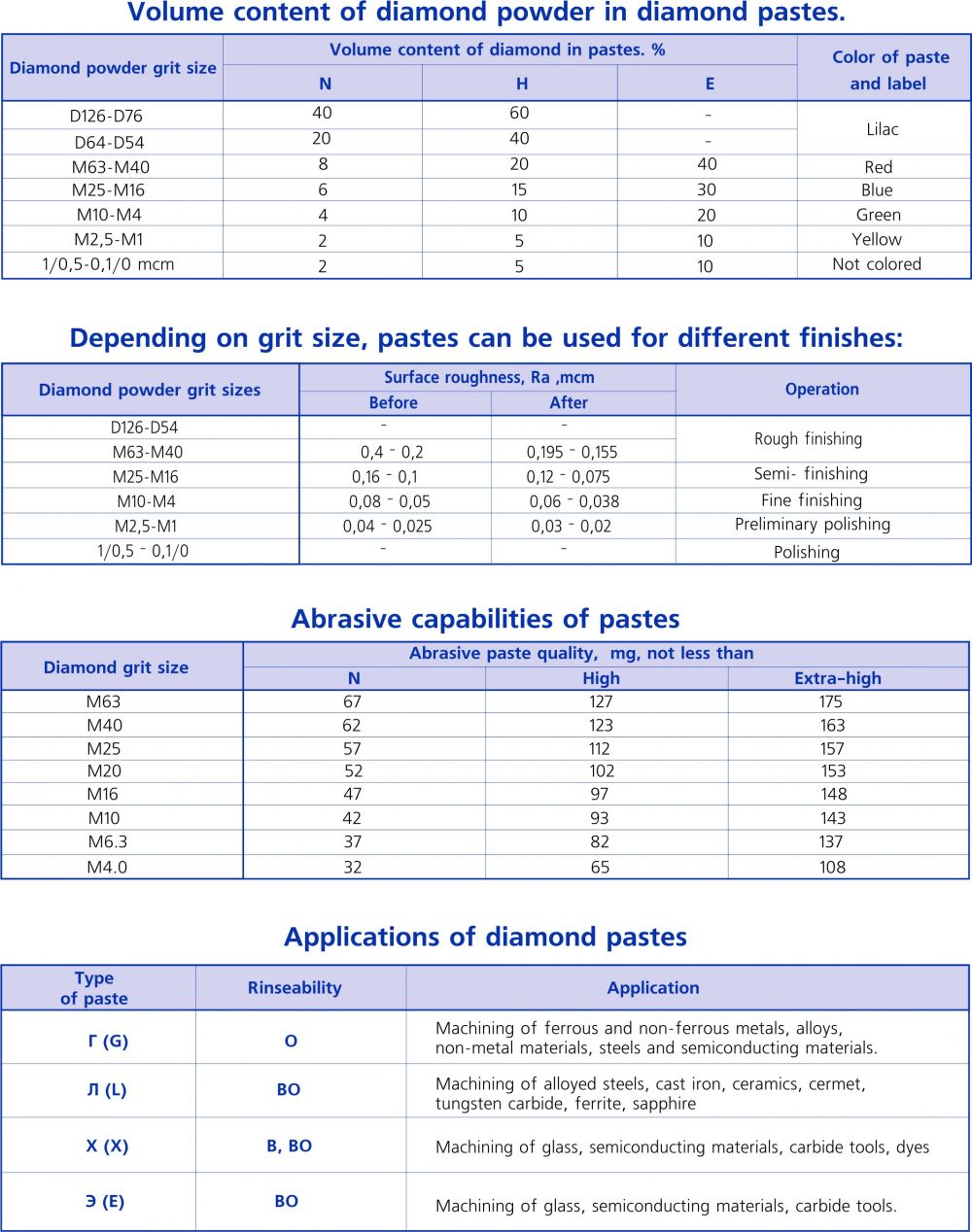 Diamond pastes are used for the finishing and polishing of ferrous and nonferrous metals, steels and semiconductors, alloyed steels, cast irons, ceramics, metal ceramics, carbide, sapphire, glass, semiconductors, and drawing dies.